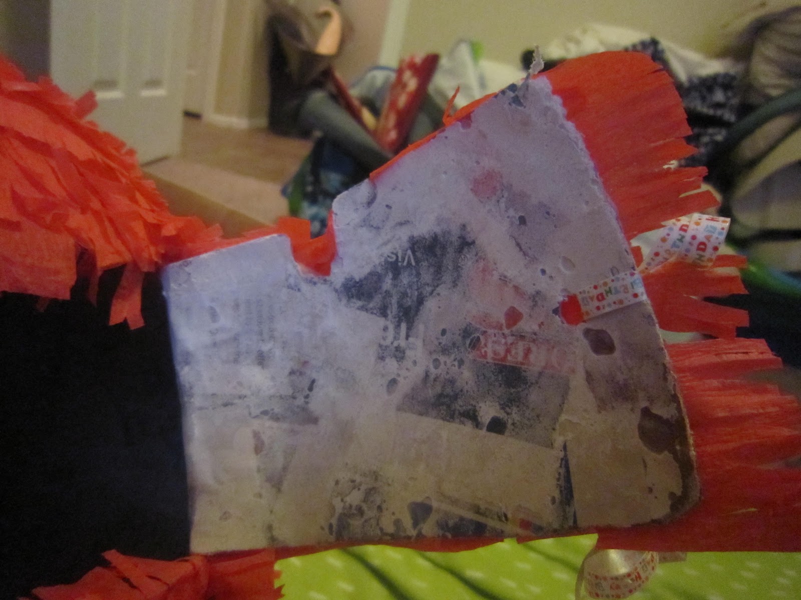 Continue covering your piñata with the fringed streamers. Switching to the other color. The black should cover just over half of the piñata.
