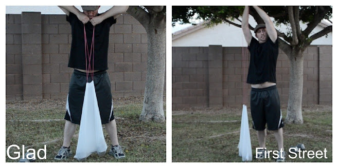 Although the First Street bag broke first the Glad bag wasn’t far behind. We also tested the strength of the ties. Both held up and didn’t break. The First Street had more elasticity and stretched further while the Glad stretched only a bit. This test convinced me further that the store brand, First Street, is more economical. I feel a lot better about sticking my trash in a $.07 bag that holds up just as well.