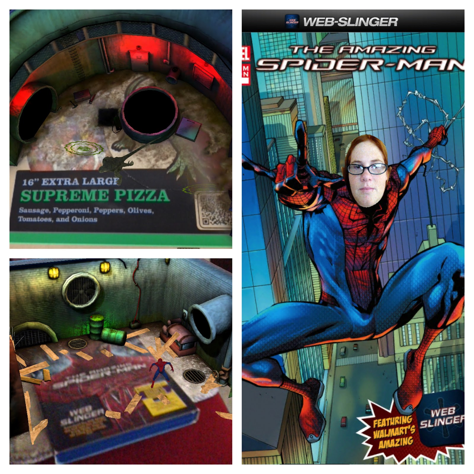 Part of the fun was using the Web Slinger app to interact with our DVD/BluRay and Marketside Pizza box; found in the deli area at Walmart. You can grab the app for iPhone or Android. It was like a scavenger hunt looking for the special displays in store at Walmart to unlock more comic book pages. My son squealed when he saw Spider-man dancing around on our DVD box.